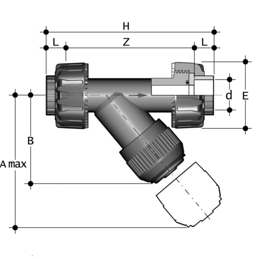 -Durchflussrichtung: Siebteil nach unten gerichtet
