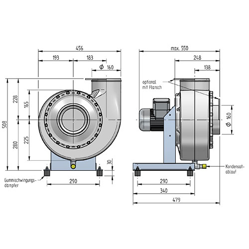 Korrosionsbeständiger Kunststoff-Radialventilator mit Gehäuse aus PE-el, elektrisch ableitfähig, in gesinterter Ausführung, einseitig saugend, Einlaufdüse mit Dichtung als Inspektionsöffnung, leicht demontierbar, Kondensatstutzen an tiefster Stelle des Gehäuses, Splitterschutz gemäß UVV als kunststoffbeschichtetes Drahtgeflecht. Laufrad PP-el mit rückwärts gekrümmten Schaufeln, elektrisch ableitfähig, statisch und dynamisch ausgewuchtet, Auswuchtgüte mindestens G 6.3 (DIN ISO 21940-11), mit Taperlock- Buchse auf der Motorwelle befestigt. Ventilatorgestell in kräftiger Stahlschweißkonstruktion in verzinkter Ausführung, mit Motortragplatte. Ventilatorgestell geeignet zur Aufnahme des Ventilatorgehäuses mit Laufrad sowie des Motors. Minimalspaltdichtung am Wellendurchgang.Gummischwingungsdämpfer und elastische Manschetten mit VA-Spannbändern für Saug- und Druckseite sind im Lieferumfang enthalten.