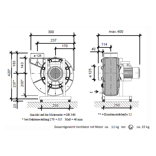 Direktgetriebener Radialventilator zur Förderung aggressiver Gase, Temperatur max 40°C Gehäuse aus PPs, in gespritzter Ausführung mit integrierten Dichtungssystem, bestehend aus Kondensatwehr als umlaufende Tropfkante und einer Labyrinthdichtung, Kondensatablaufstutzen an der tiefsten Gehäusestellung Laufrad mit rückwärtsgekrümmten Schaufeln aus PPs, in gespritzter Ausführung mit Rückenbeschaufelung für garantierten Unterdruck an der Wellendurchführung im Betrieb Gehäusestellung GL, Ausblasrichtung 45° / 90° / 135° / 180° / 270° / 315° /360° Grundrahmen: Stahl-verzinkt Antrieb : Normmotor 3 x 230/400V, 50 Hz, IP55, Wärmeklasse F mit Thermokontakt Zubehör : Gummi -Schwingungsdämpfer Volumenstrom m3/h 30 - 300 Druckdifferenz PA 110 - 30 Schutzart PTC (Kaltleiter) Polzahl 4 Sync. Drehzahl bei 50 Hz 1500 1/min Motorleistung kW 0,06 Nennstrom bei 400 V 0,35 A Baugröße 56 Bauart B5 / IP55 |