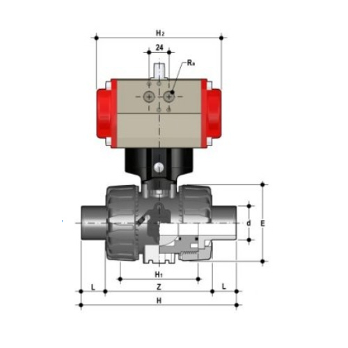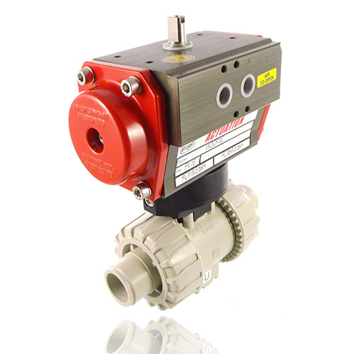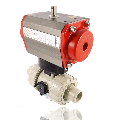2/2-Wege-Kugelhahn mit gesicherten Überwurfmuttern aus PP mit pneumatischem Stellantrieb