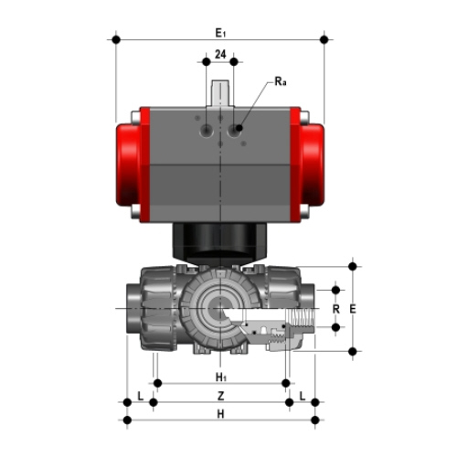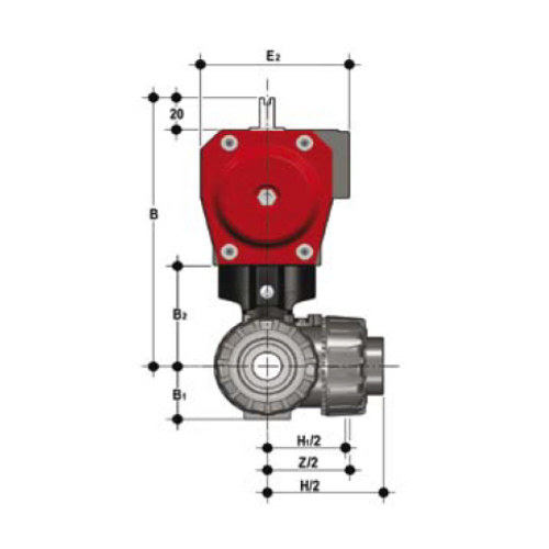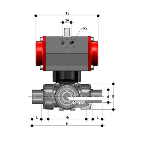 | 3-Wege-Kugelhahn aus PVC-U mit pneumatischem Stellantrieb Funktion: einfach wirkend, inklusive optischer Stellungsanzeige Kugel mit T-Bohrung Standardkugelstellung: 1 Steuerdruck: Standard 5 bar reduzierter Steuerdruck: auf Anfrage Steueranschluß: G 1/8' Namur (DN10 - DN15) G 1/4' Namur (DN20 - DN50) Anschluss: Gewindemuffe Dichtung PTFE/FPM |