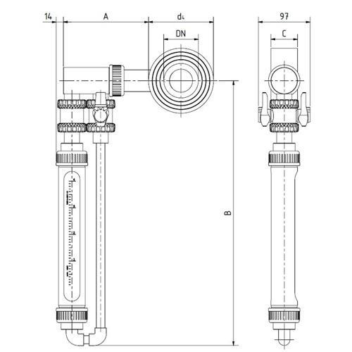 Die umfangreiche Materialauswahl bei unseren Nebenstrommessgeräten DST ermöglicht die Durchflussmessung von unterschiedlichsten Messstoffen. Das kostengünstige Gerät in PVC kommt häufig in der Badewassertechnik zum Einsatz. Für die Durchflussmessung aggressiver Medien, z. B. in der Wasseraufbereitung, bietet sich das Gerät in PVDF an, während der DST-1/2 in Stahl hauptsächlich für die Messung von Luft und Gasen eingesetzt wird. Der Messbereich reicht bei H2O von 0,02-0,16 bis 300-1800 m3/h, bei Luft von 0,15-1,5 bis 1200-6000 m3/h i.N. Das Nebenstromdurchflussmessgerät DST arbeitet nach dem Wirkdruckverfahren. In die Rohrleitung wird ein Ring mit einer Messblende eingebaut. Die Messblende führt zu einer Einschnürung und bewirkt einen Druckabfall. Dieser Druckabfall ist quadratisch proportional zum Durchfluss. Verbindet man die Druckentnahmestellen die vor und hinter der Blende liegen mit einer Leitung, so fließt in dieser Leitung ein Nebenstrom. Dieser Nebenstrom ist ein Maß für die Durchflussmenge des Stromes in der Hauptleitung. Durch zwei in die Nebenleitung integrierte Kugelabsperrhähne ist es möglich, den Nebenstrom bei Bedarf an- bzw. abzuschalten. Durch den Einbau von elektrischen Grenzwertschalter, die über den gesamten Messbereich verstellbar sind, lassen sich die Geräte auch als Wächter einsetzen. |