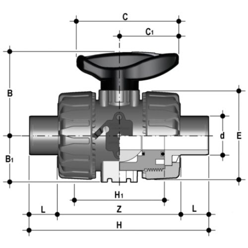 | -Anschluss: PVDF-LS-Stutzen zum Heizelementstumpf- und IR-Schweißen -radial ein- und ausbaubar -mit gesicherter Überwurfmutter -Dichtung: PTFE/FPM -ab d 75 mm kundenspezifisch kennzeichenbar mit "Labelling System" (siehe Zubehör) |